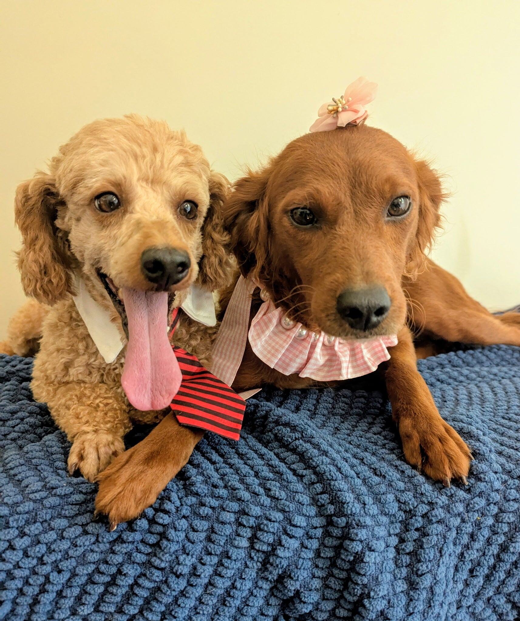Pearl and Teddy are expecting a litter of puppies in November, ready for new homes in January. They are expected to weigh 12-16 lbs as adults. They're all cream to apricot and curly haired.